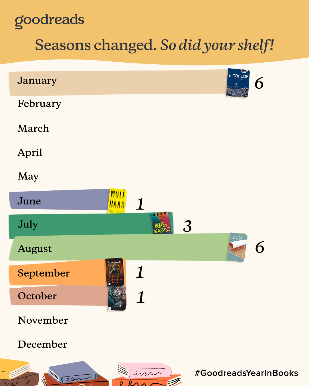 Mit 18 Büchern konnte ich dieses Jahr mein Level von 2024 halten. Die Statistik zeigt aber schön, dass ich ein Urlaubs-Leser bin und mir ansonsten zu wenig Zeit für das Lesen nehme. Mehr Details gibt es wie immer bei Goodreads.