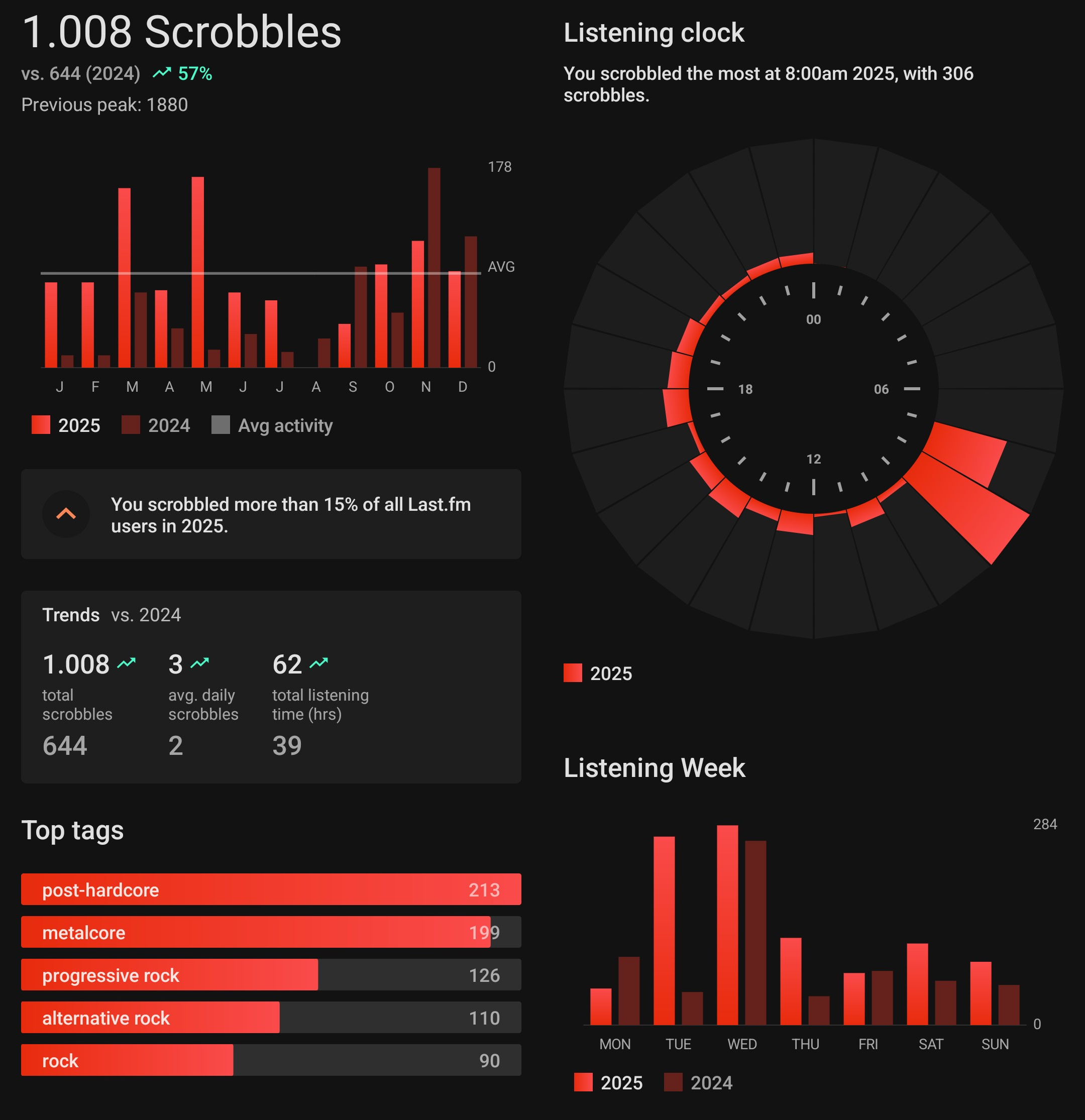 Nachdem ich 2024 endlich auf einen Familienaccount bei Youtube Music umgestiegen bin, gibt es nun auch Statistiken, die nicht von Bibi Blocksberg und Imagine Dragons verfälscht sind. Da das Tool aber nicht versteht, dass ich hauptsächlich Alben von vorne bis hinten höre, greife ich doch lieber auf die Daten bei Last.fm zurück. Und dort zeigt sich: Ich habe fast doppelt so viel Musik gehört verglichen mit 2024, was vermutlich an der höheren Qualität der Releases liegt. So haben meine long-time favourites Coheed and Cambria, Underoath und The Birthday Massacre allesamt abgeliefert und mich über das Jahr getragen.